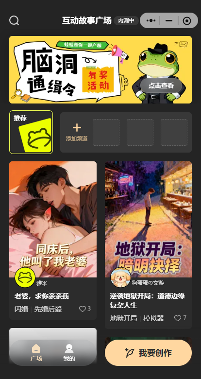 "上头蛙"的核心竞争力在于其高度参与感与社交化设计理念。从曝光的产品界面来看,平台内置"互动故事广场"功能模块,聚合了大量由 AI 辅助生成或用户共创的情节单元。内容题材覆盖范围广泛,包括热门影视动漫 IP 衍生作品、都市情感、悬疑推理以及极具网络特色的轻喜剧桥段,例如近期引发小范围讨论的"顶级海后新年短信"等话题性内容,精准契合年轻用户的兴趣偏好与社交传播需求。